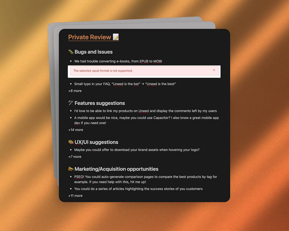 Feature suggestions, UX/UI improvements, bugs and issues, and finally, marketing ideas and acquisition opportunities.