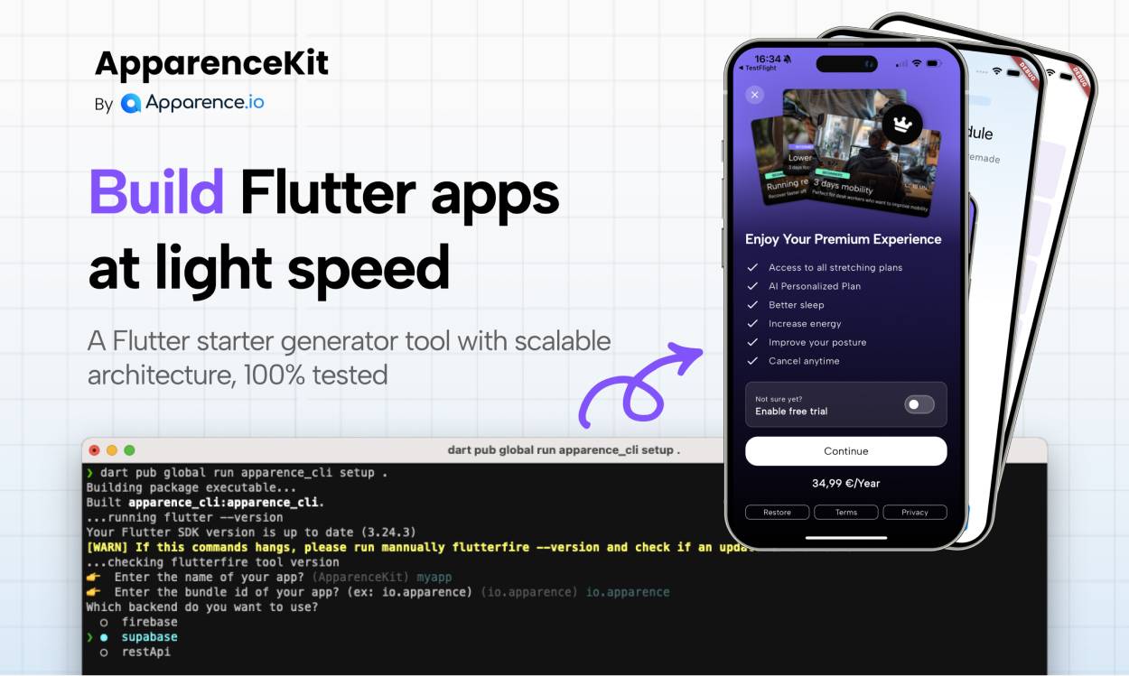 ApparenceKit is a Flutter boilerplate that allows developers to quickly and easily create apps for Android, iOS, or the web. Within just a few days, you can have a fully functional app connected to a backend, with features like authentication management, push notifications, and monetization through RevenueCat.