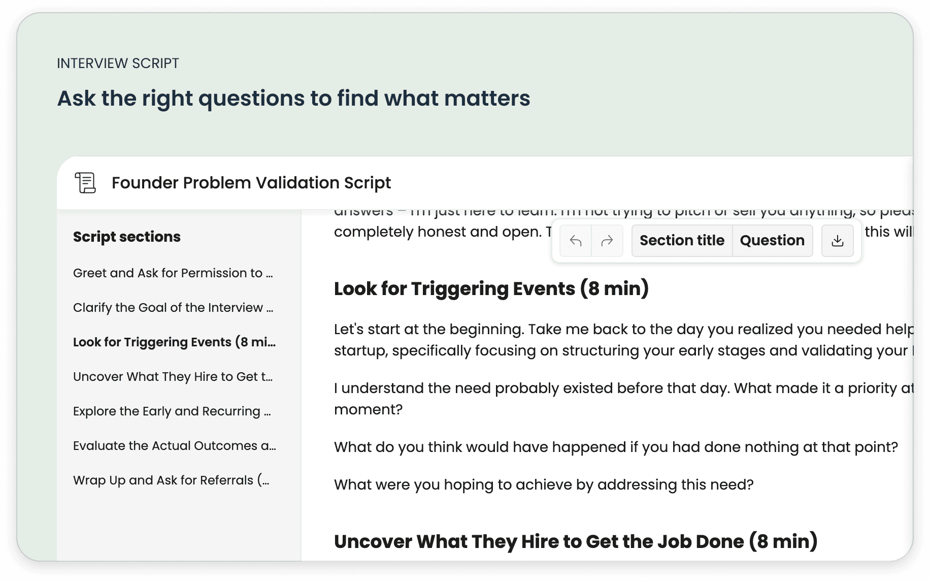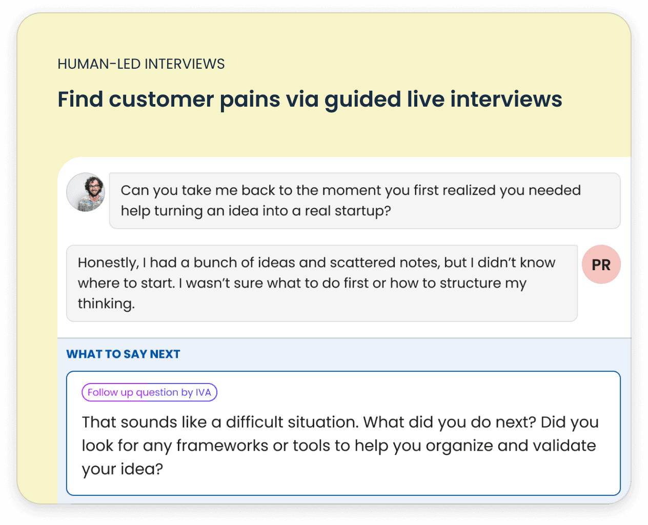 Some founders realize the importance of validating their idea, but don't know how to approach it and mix problem validation interviews with sales calls, ending up with neither validation nor a sale. A proper idea validation process is meant to provide deep insights into the following: