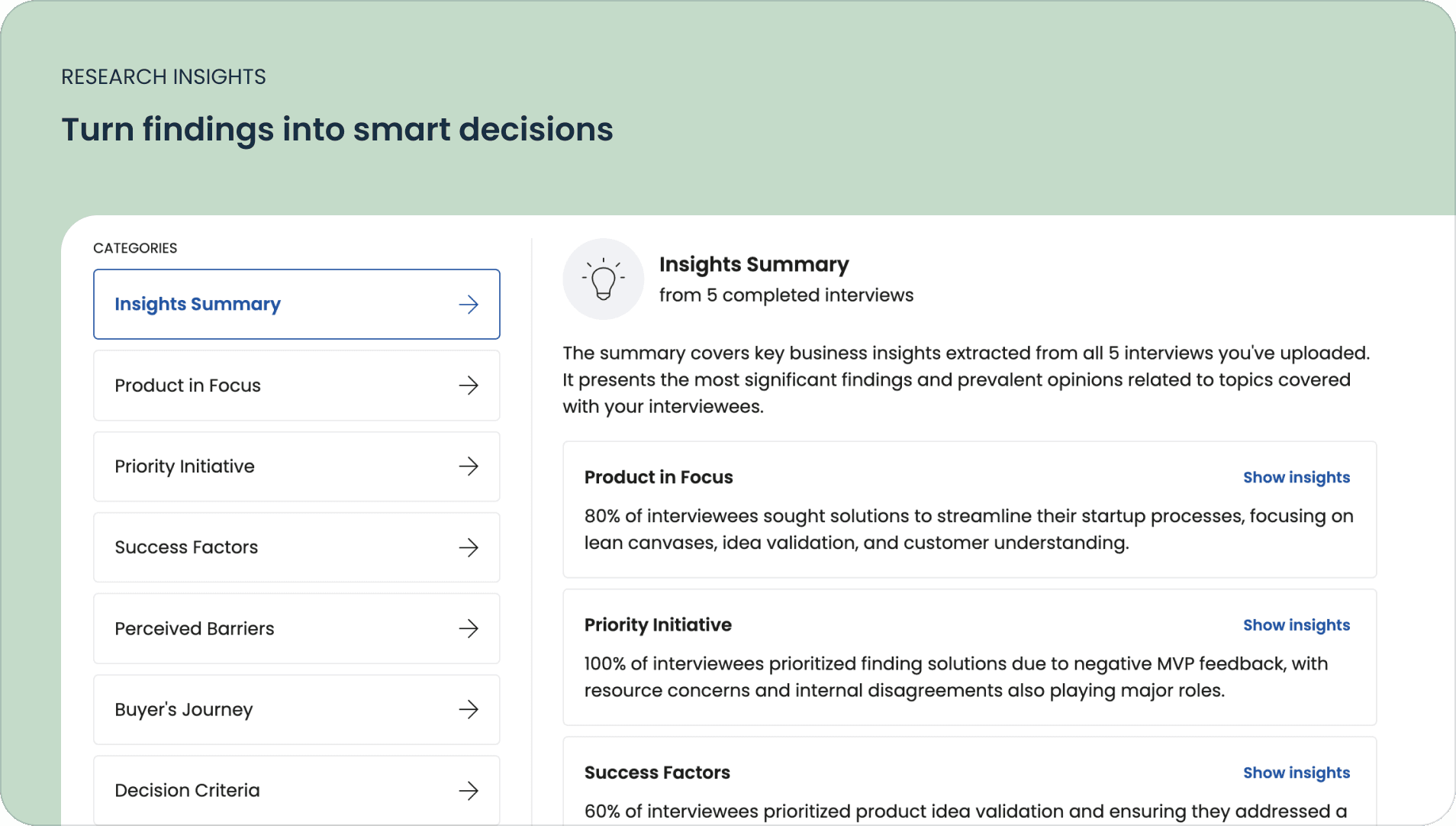These are natural biases, but cannot be used as a reliable signal for idea validation. It's common to fall victim to confirmation bias - hearing only things that we want or expect ot hear. Conducting reliable analyses of tens and even hundreds of conversations is a tedious job, and it's even harder to remain objective and unbiased.